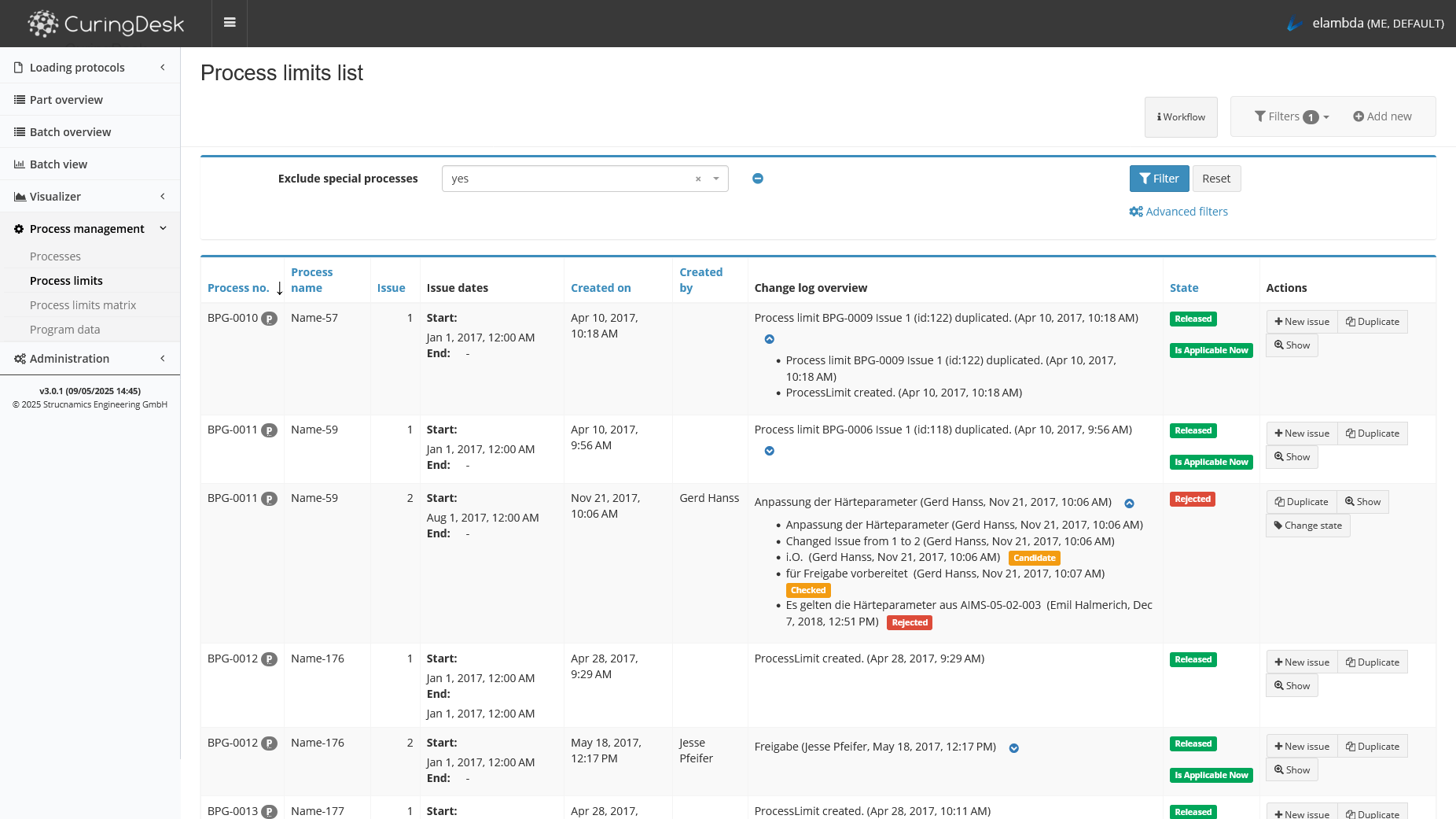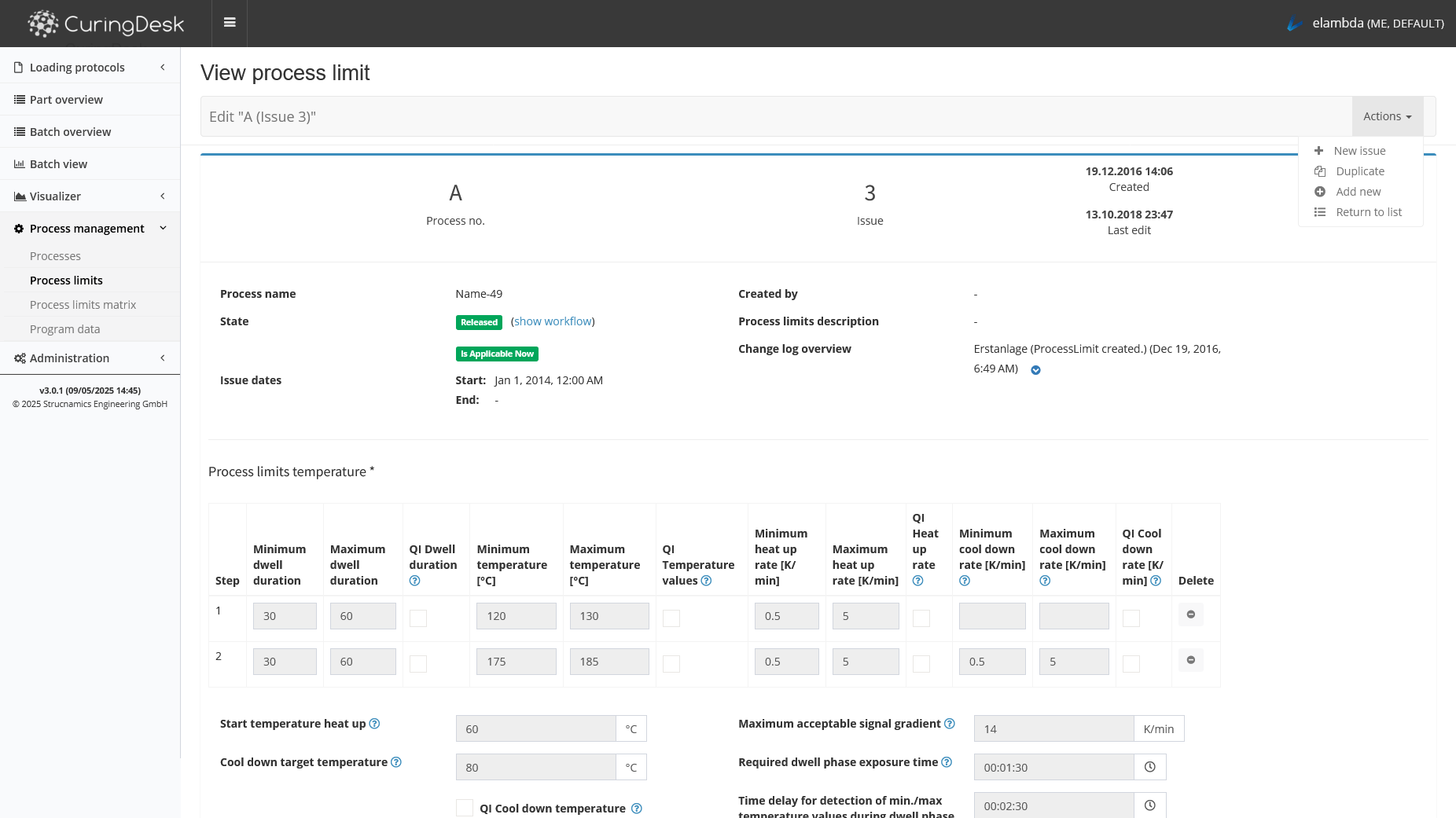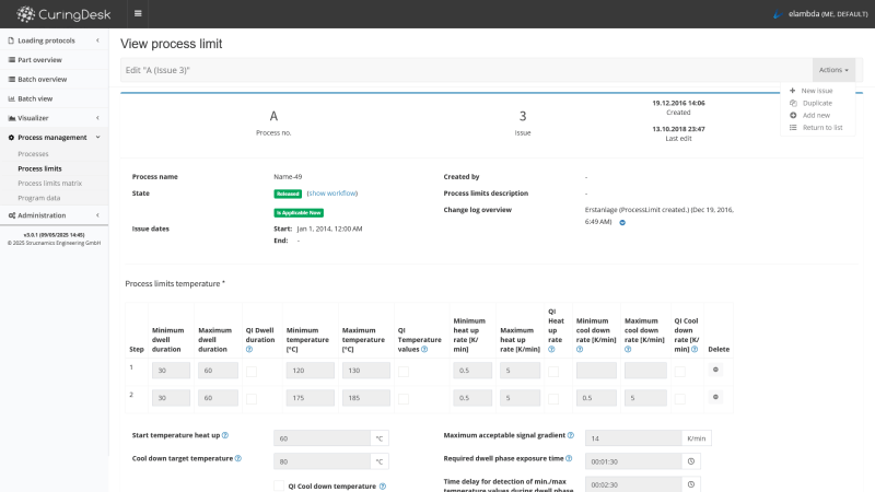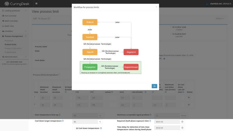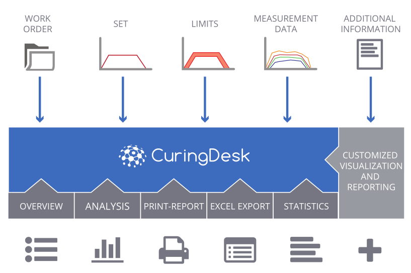 Various data sources like work orders, set-curves, curve limits and measurement data are unified in the database of CuringDesk. All data is available on the intranet (PC, tablet, etc.) via the browser. The administration of process set parameters and evaluation limits is centralized and version controlled.